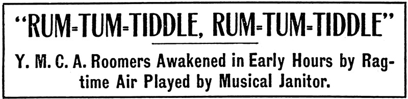 Sixty-five years before the Village People sang "Y.M.C.A.," the chorus was "Rum-tum-tiddle," as we see in this headline from The Duluth Herald, 1913. "Y.M.C.A. roomers awakened in early hours by ragtime air played by musical janitor." We aligned the words to the melody, for your convenience.