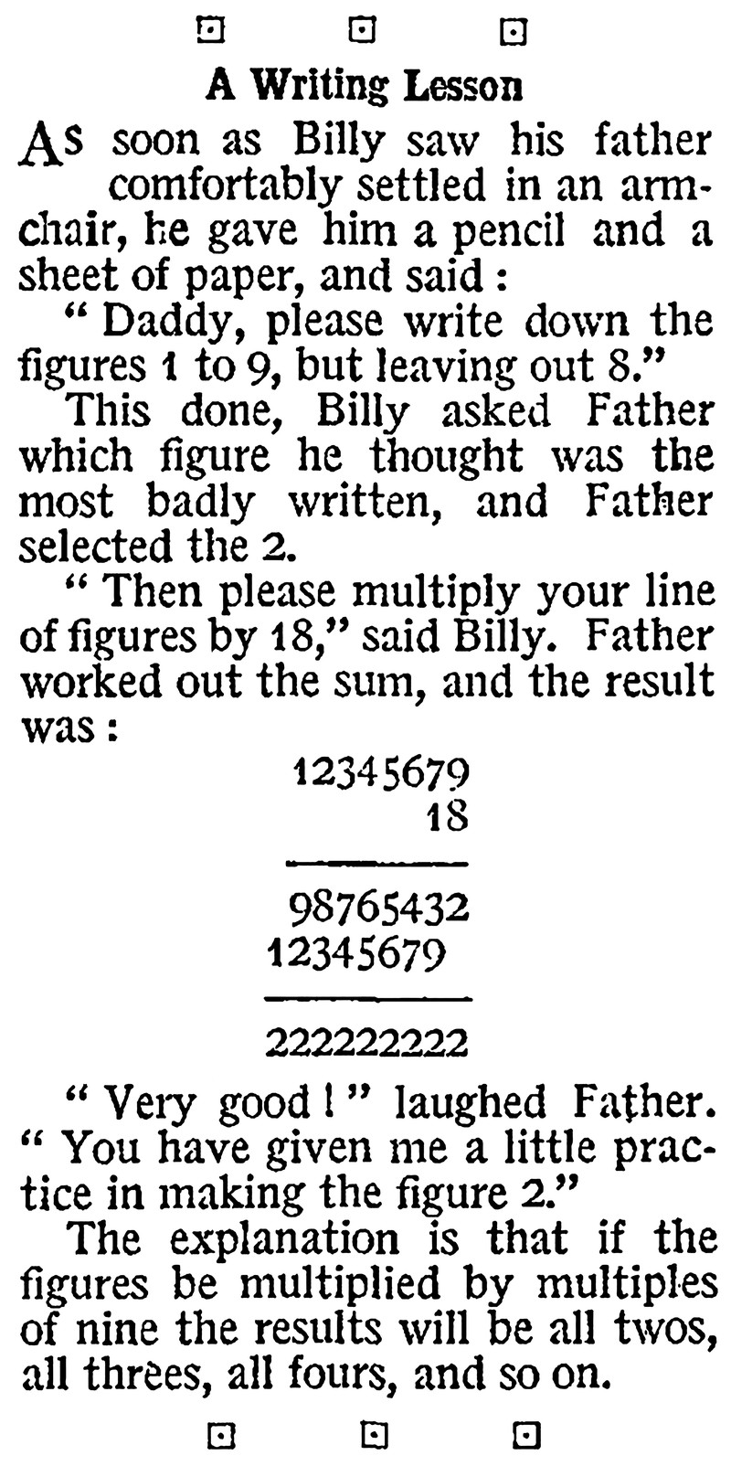 "All you worthless little Naughts (said Mr. One), now run away! Said they, We think, on second thoughts, you will ask us all to stay: alone, we are worthless, it is true, but six of us make a million of you." From The Children's Newspaper, 1936.