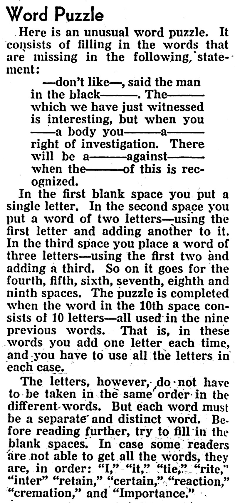 "An old riddle of the new year: A father has just twice six sons. Not one e’er sees his brother. Of thirty daughters to each son, not one e’er sees the other. Each daughter’s life twice twelve doth count. Of strange facts here’s another: One-half their lives they’re white as light, and black as night the other."