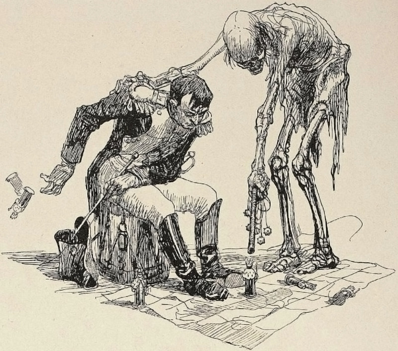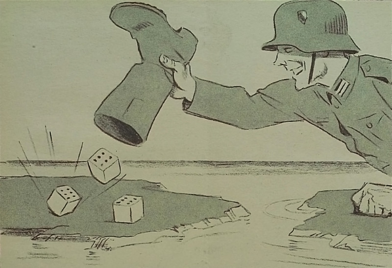 From Kladderadatsch, 1938. For the secret of why to roll blank dice, see Astragalomancy: A Loaded Guide: Intriguing Readings of 21 Discrete Dice Throws. By the way, in his novel Bury Me Among the Graves, Tim Powers describes organized dice rolling without looking at the numbers: "The old dwarf tossed the objects to the floor, and Crawford saw that they were dice. McKee turned and caught Crawford's chin in her hand. 'Don't look at the numbers on them,' she said. 'But if you want to be helpful, you could pick them up and throw them, over and over again. Not looking, remember.' ... As he dropped the dice one more time onto the floor, it occurred to Crawford that he had been hearing this repetitive rattle ever since they had entered this chamber. Were these dice thrown perpetually, their numbers never read? Chuchuwee must employ a relay of children to keep it up."