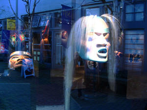 An artist called Highwireart took this photo of an exhibit of Pacific Northewest native masks in Vancouver British Columbia. Can you locate the 9 masks in the photo as well as the woman? Click here for a large sized version of the photo.