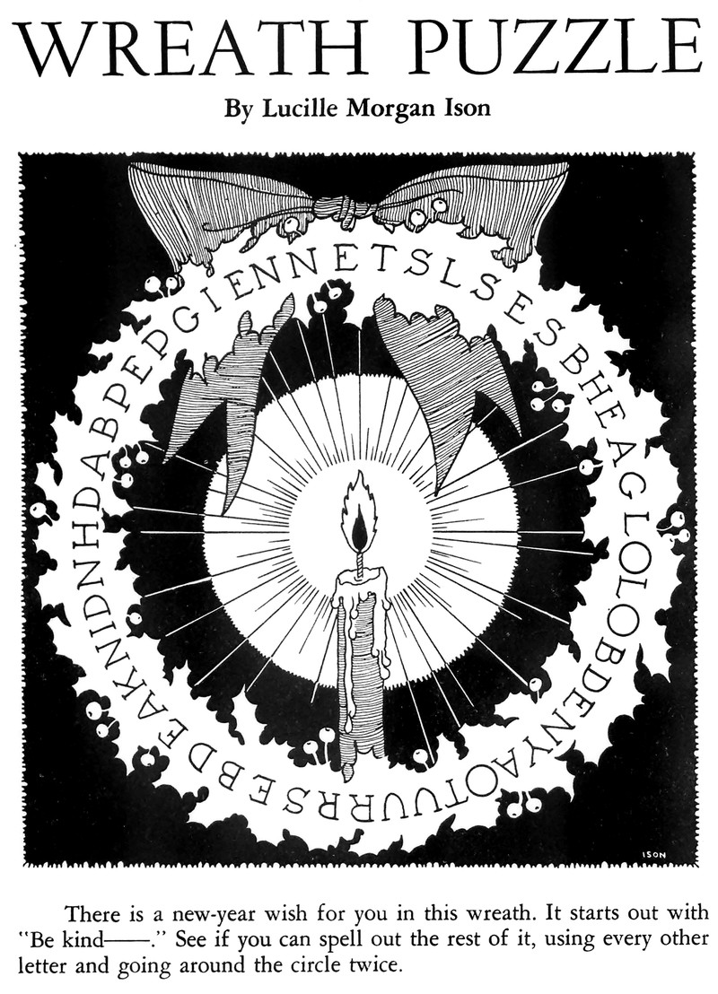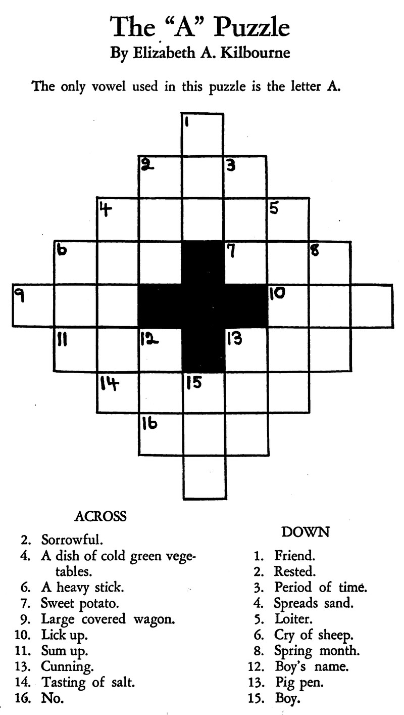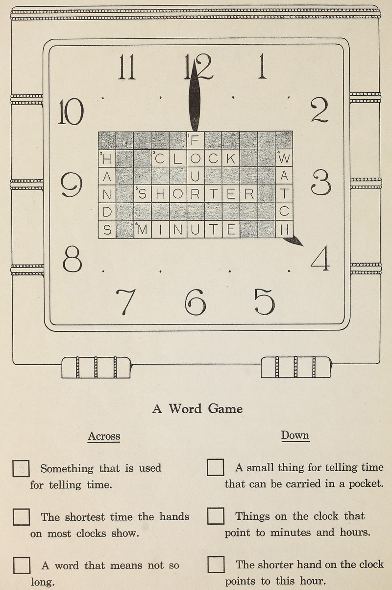 In this unusal crossword puzzle, you're to determine not the words but the numbers of the across and down clues. From Think-and-Do Book to Accompany More Friends and Neighbours, 1940.