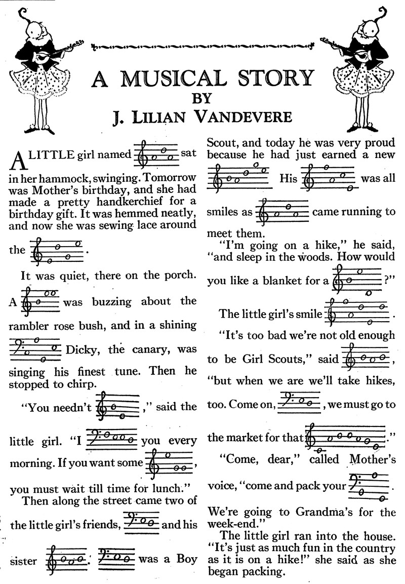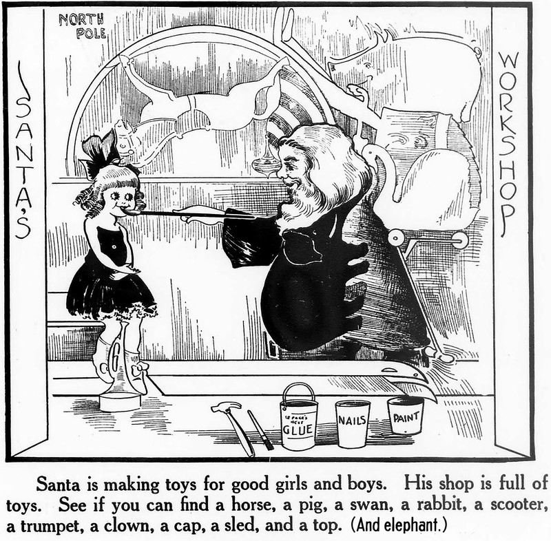 From Wee Wisdom, 1938. Answers: Pedro's mother and father's silhouettes are in the mountain range on either side of Pedro's head, each looking upward and facing a different direction; one of Pedro's shoes is upside down on the hill behind his shoulder, and the other shoe is on the hill at the far right; the church with one steeple is upside down in the clouds on the upper right; the name of Pedro's country is in the logs on the cart, next to Pedro's leg; what Pedro carries to church is in the middle right of the ground;