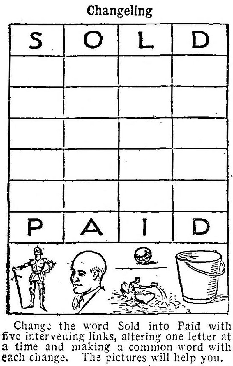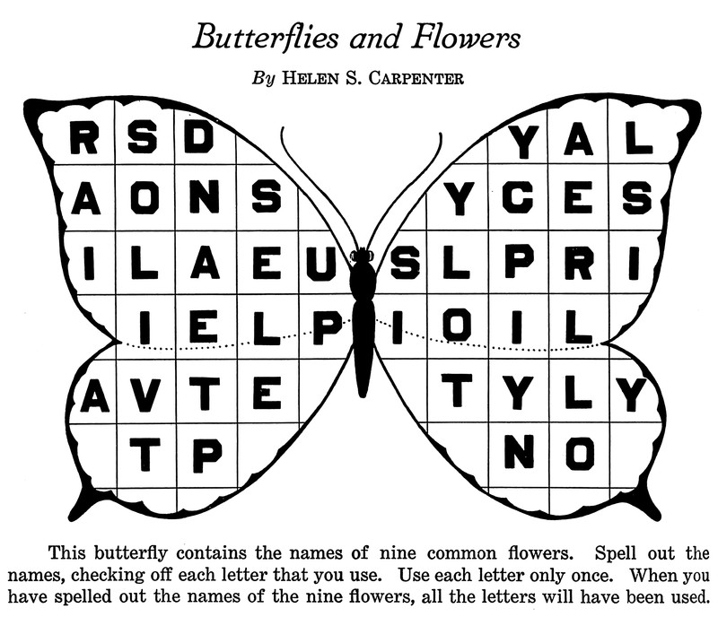 From The Children's Newspaper, 1938. Answers: Outer oval - partridge and blackbird. Middle oval - starling and pheasant. Inner oval - swallow and lark.