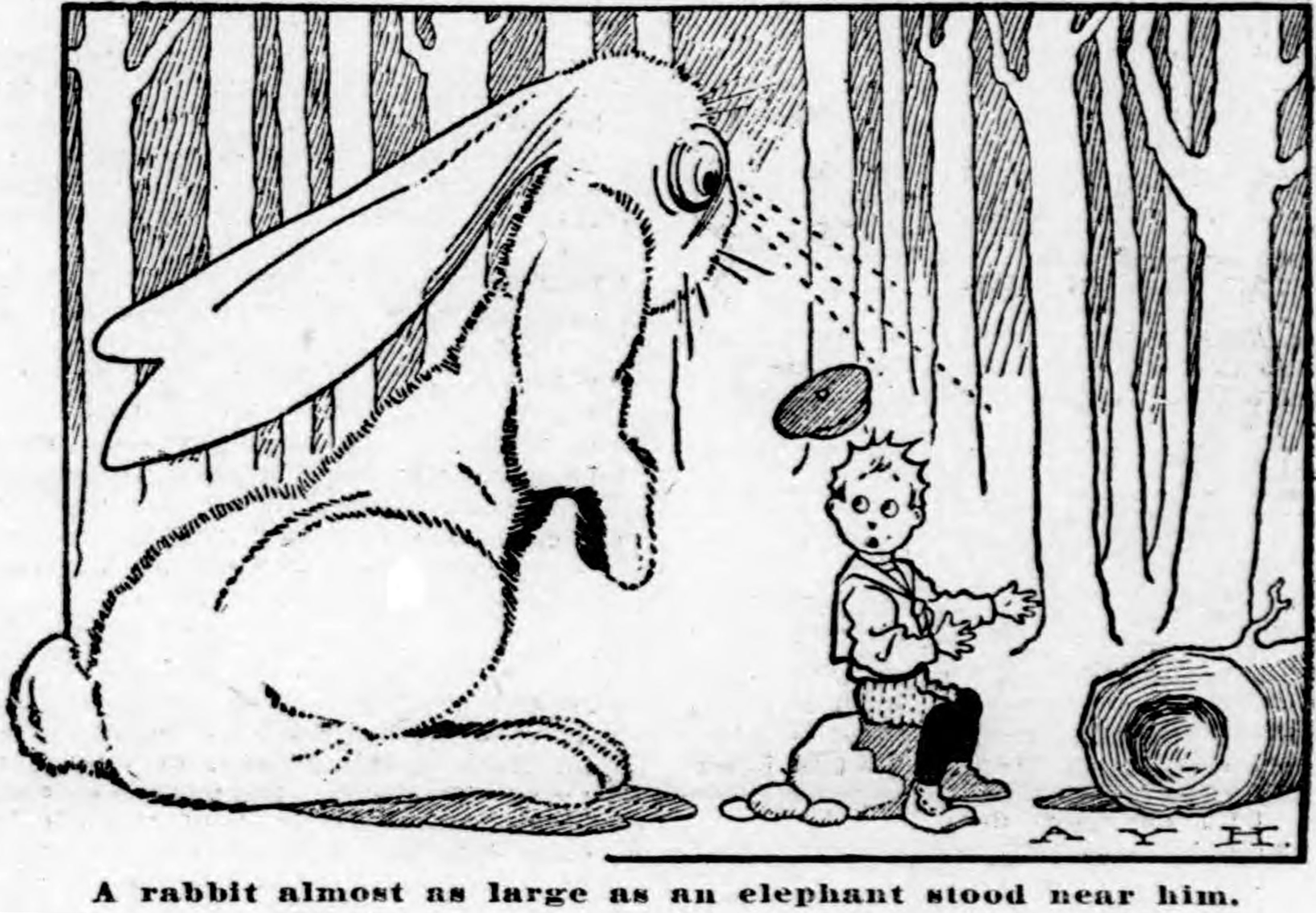 "A rabbit almost as large as an elephant stood near him."  From the Duluth Evening Herald, 1907.