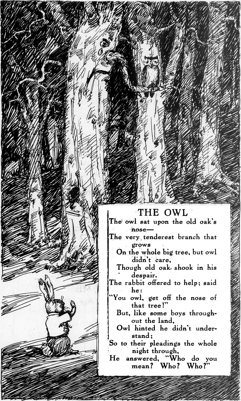 #vintage illustration #owl #anthropomorphism #rabbit #faces in things #1920s #tree face #illustration #poem