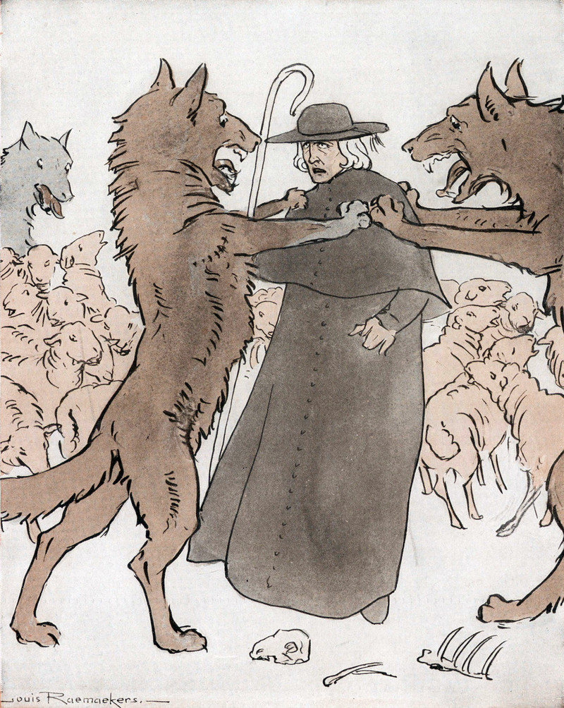 #vintage illustration #political cartoon #wolf #animal attack #shepherd #sheep #illustration