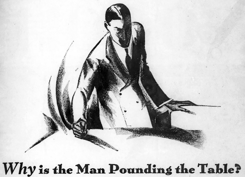 "Why is the man pounding the table?"  From the New Yorker, 1929.