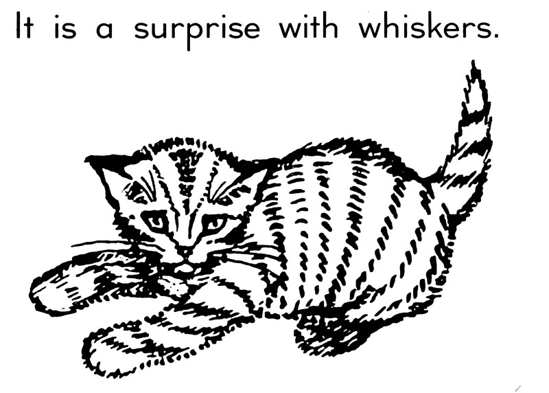 "It is a surprise with whiskers."  From We Can Read Mr. Whiskers by Gerard, McInnes & McLean, 1962.