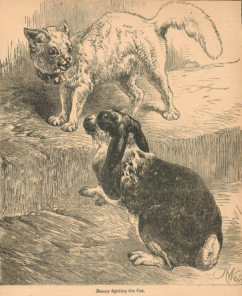 Bunny versus cat: which would you wager to win?  From Chatterbox, 1885.