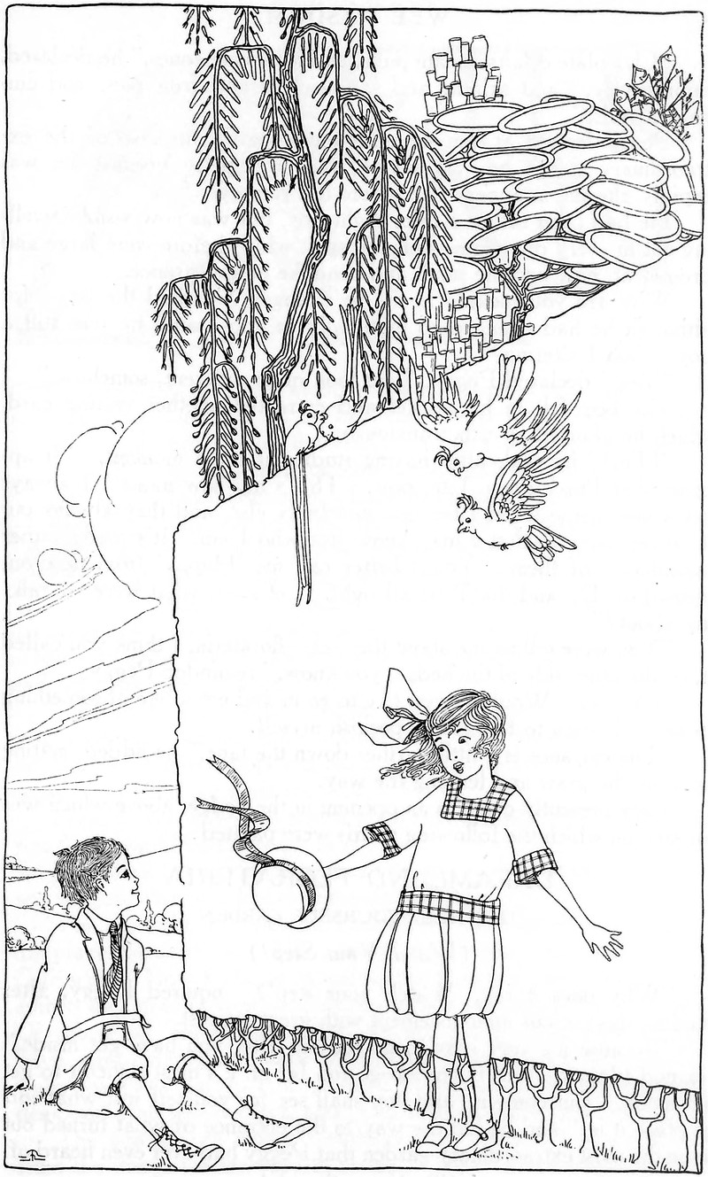 Forks, knives, spoons, plates, and glasses grow on trees, and tables grow on hedges.  From Wee Wisdom, 1921.