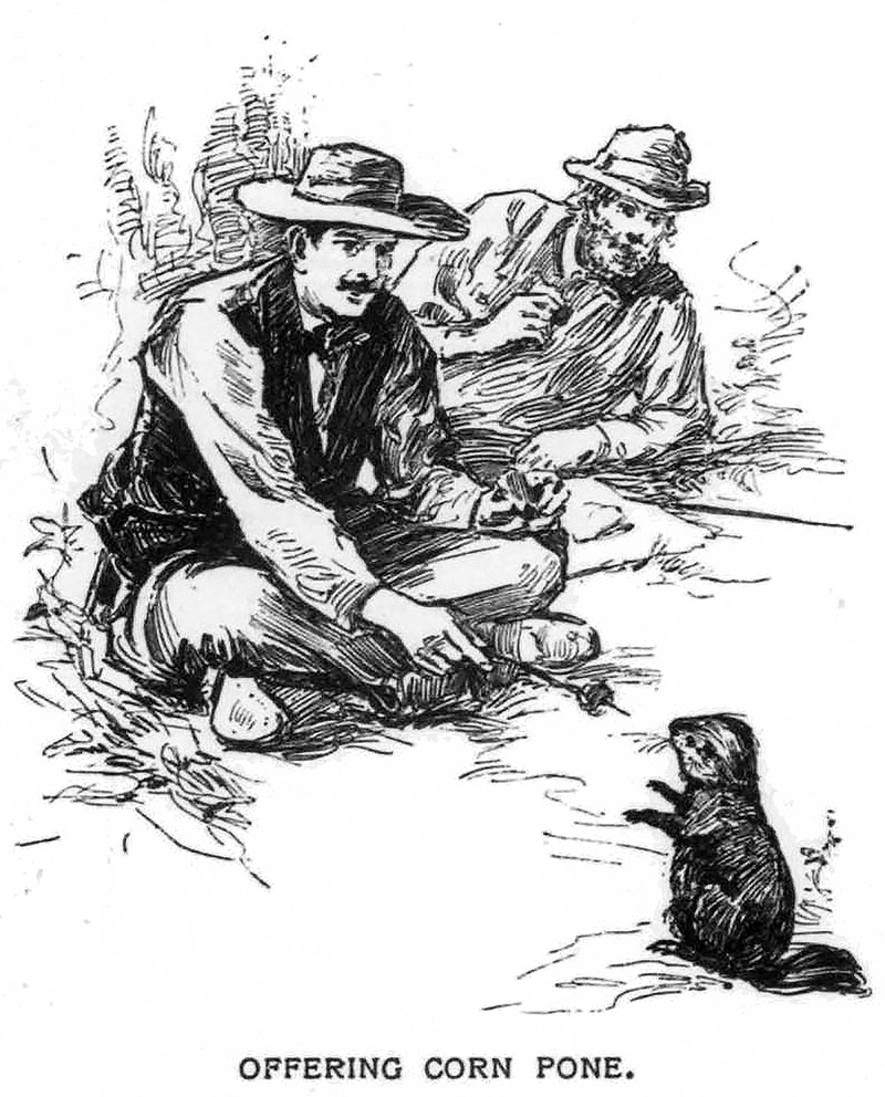 Offering corn pone to a groundhog.  From Youth's Companion, 1900.