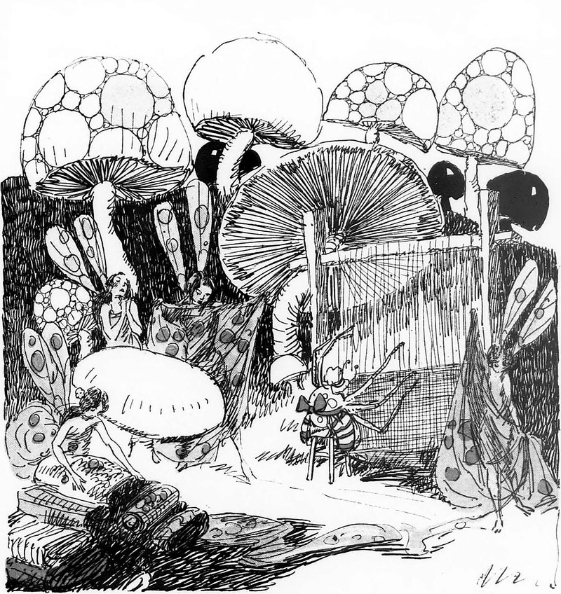 #vintage illustration #fairy #anthropomorphism #spider #mushroom #1920s #illustration #weaving