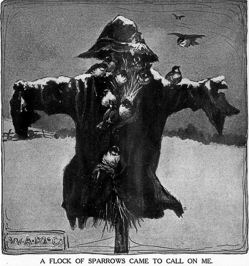 #vintage illustration #scarecrow #bird #illustration #1910s #sparrow