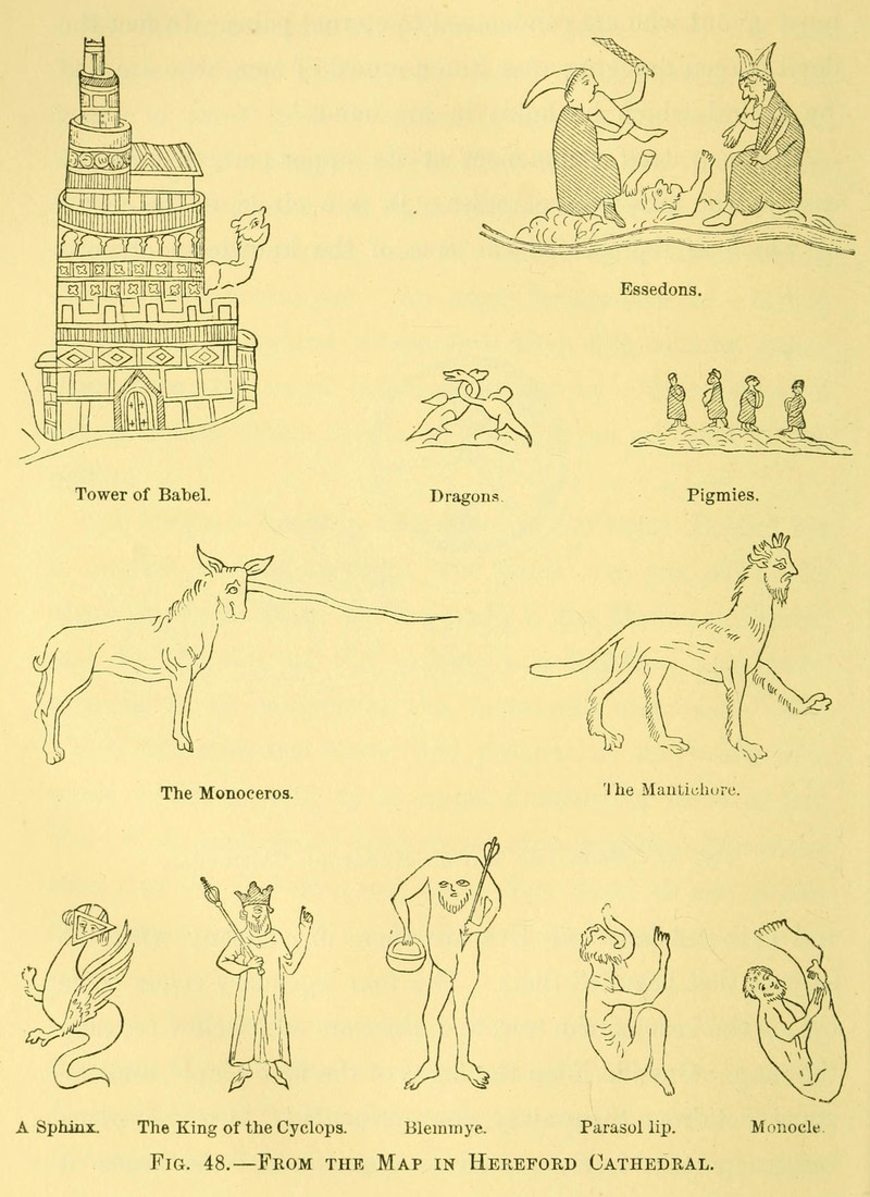 "From the map in Hereford Cathedral."  From Astronomical Myths, Based on Flammarion's "History of the Heavens" by J. F. Blake, 1877.