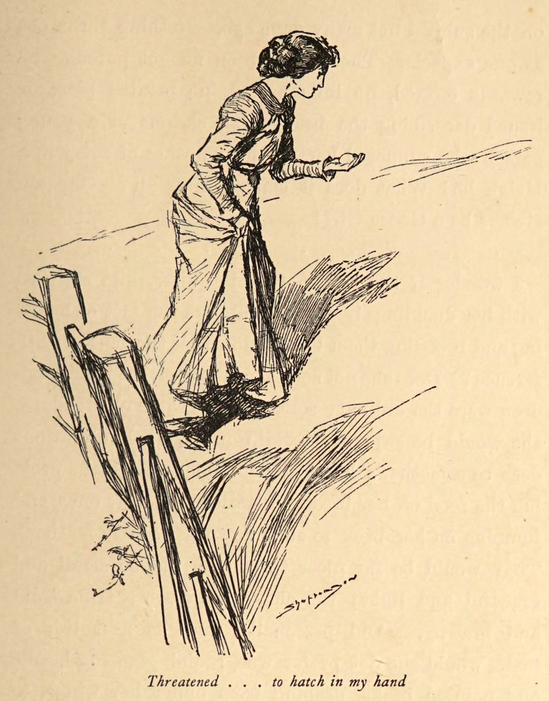 "Threatened to hatch in my hand."  From The Diary of a Goose Girl by Kate Douglas Wiggin, 1902.