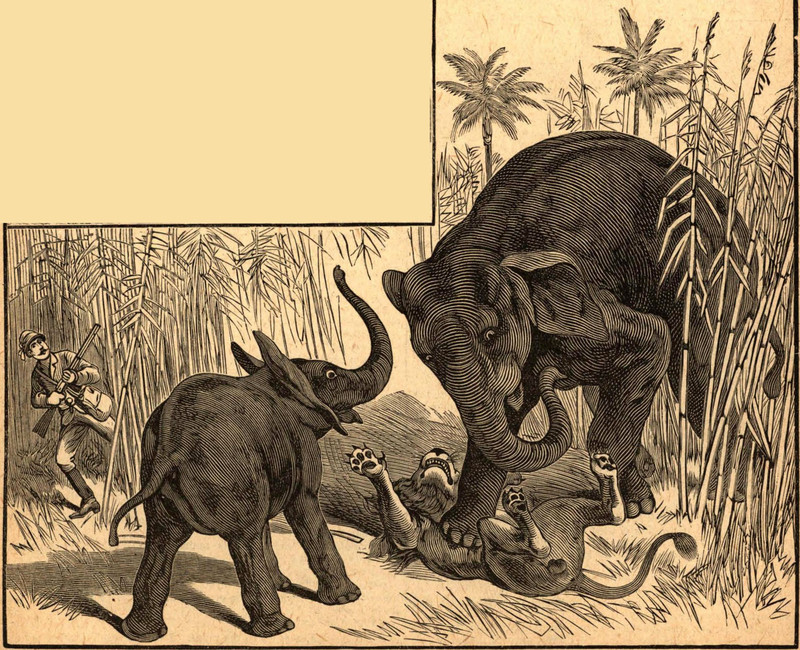 Elephant versus lion.  From Franke Reade Weekly Magazine, 1896.