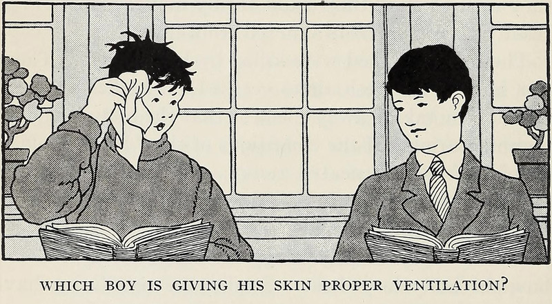 "Which boy is giving his skin proper ventilation?"  From Community Health by C. E. Turner, 1935.