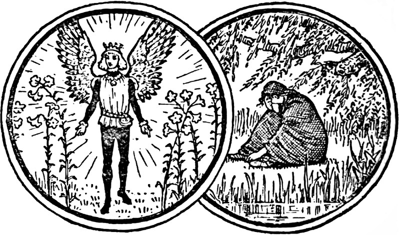 Two sides of the same coin in The Old Fashioned Fairy Book by Mrs. Burton Harrison and illustrated by Rosina Emmet, 1887.