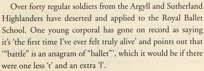 We fact-checked this, and it's true: "battle" would be an anagram of "ballet" if there were one fewer "t" and an extra "l." From Livin' the Dreem by Harry Hill.