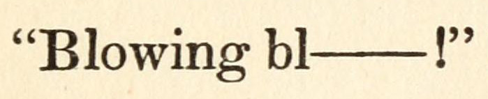 Interesting that oaths in print seem prone to self-censorship. In this 1921 example, the expression is “Blowing blizzards!” We're now prepared to say that an expletive’s very long dash is a rapier, and rather than diminishing any impact, it thrusts the point home.
