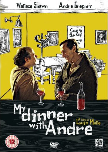 Looks like the artist for a new British release of My Dinner with Andre misread "dinner" as "diner." There's certainly no "Soup of the Day" sign at the swanky restaurant in the film! And that coat check lady looks as thin as a rail!
