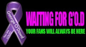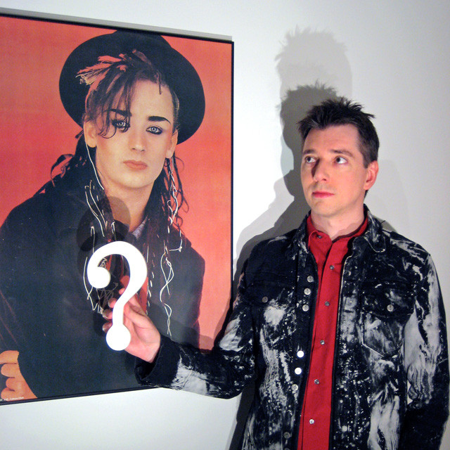 We question the premature apostrophe in a banner made in honor of the recently incarcerated singer/songwriter Boy George. In the purple ribbon, the apostrophe appositely hovers between the O and the Dowd, but the mark skips ahead one place in the initials (perhaps to indicate hopes for an early release from prison). Does the unexpected period between the O and D subliminally suggest an abbreviation for "overdose," as drugs figured into the charges? In any case, here's a " get out of jail free" card for you, Boy George.