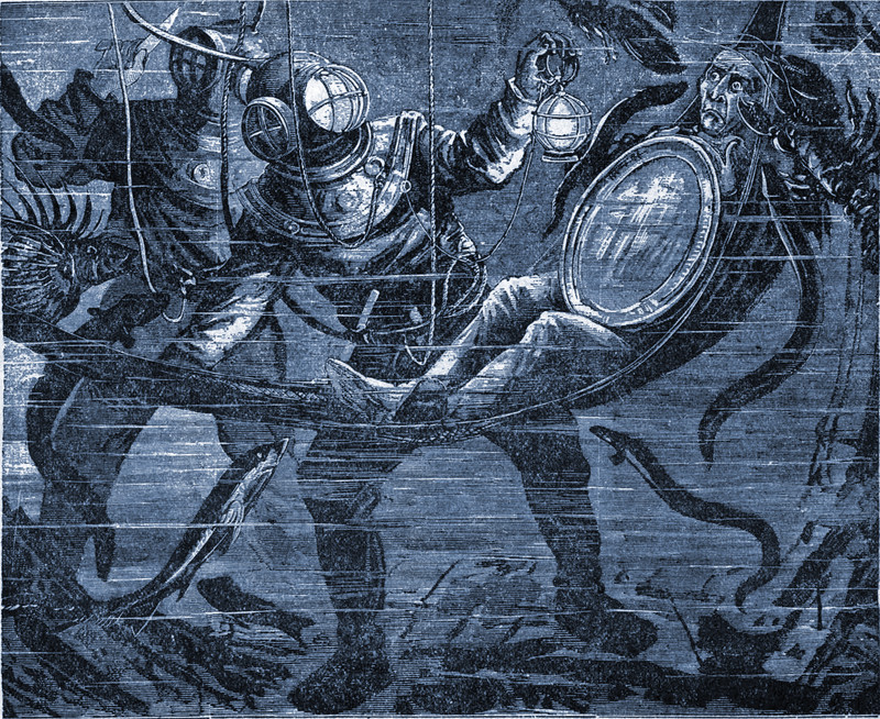#vintage illustration #sea monster #octopus #under the sea #tentacles #illustration #diver #submarine