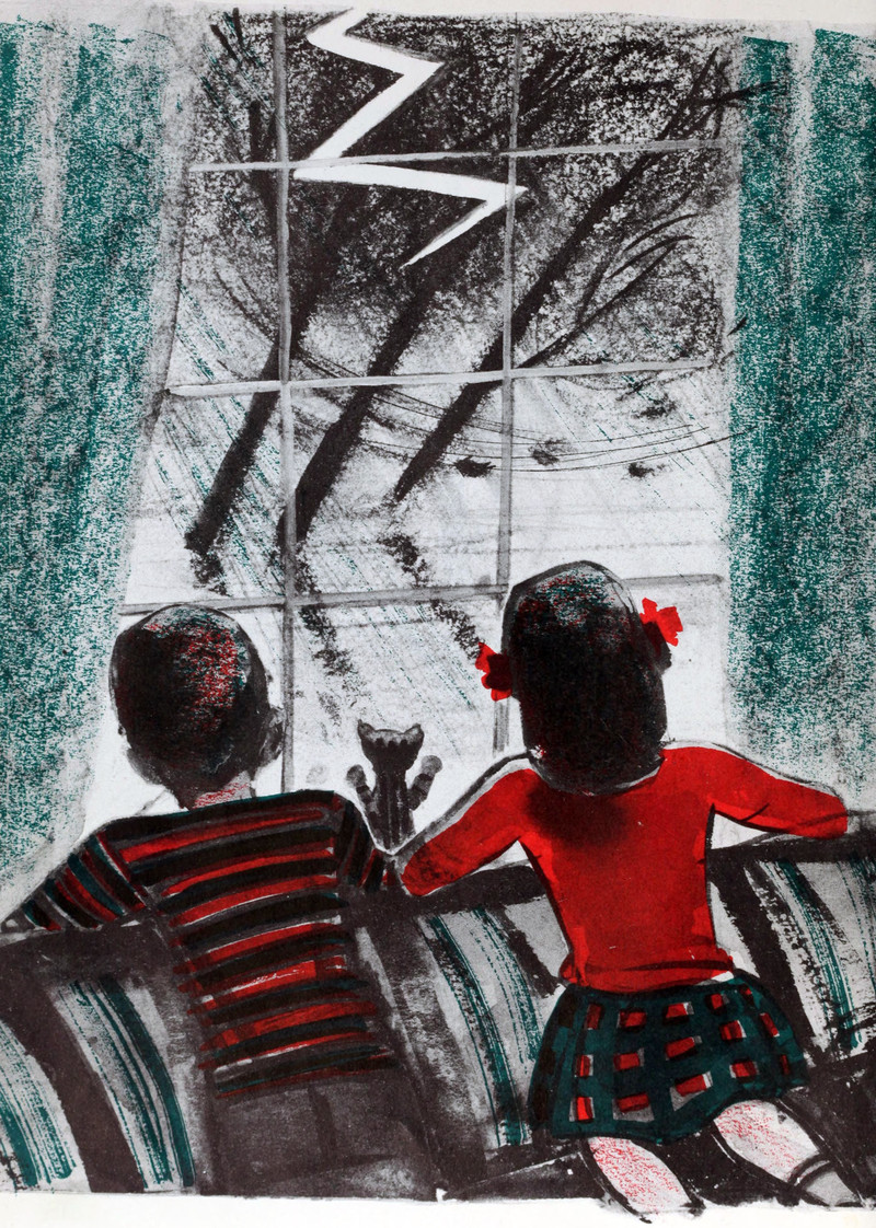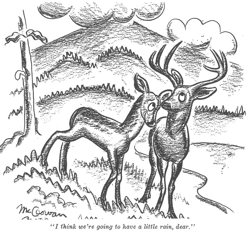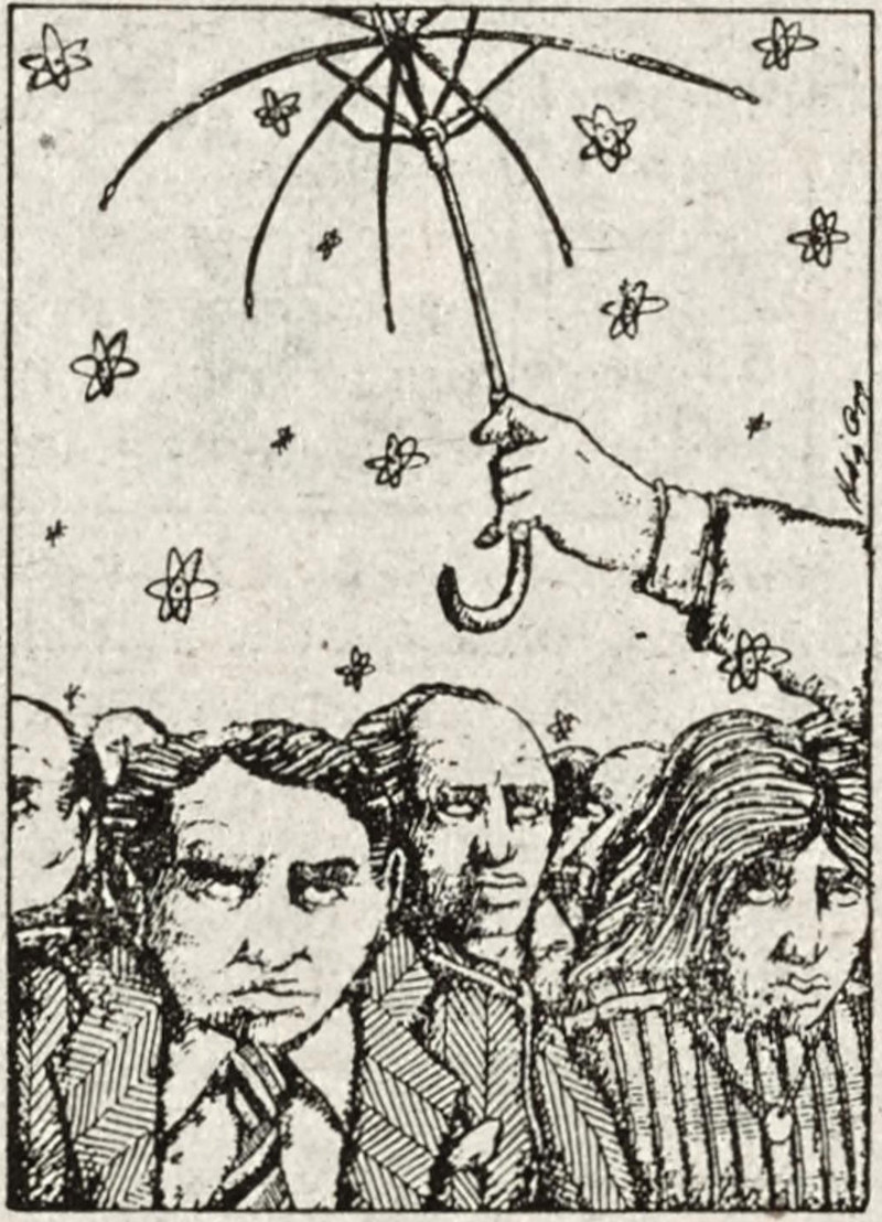 That's the only type of umbrella to use when it's snowing, as it won't get burdened by the weight of accumulated flakes. However, those might not be snowflakes here. From The Gateway, 1981.