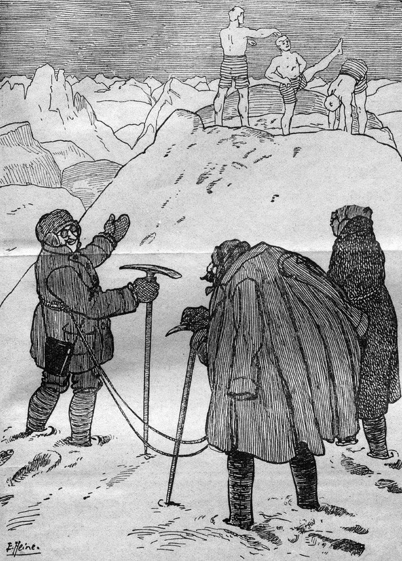 One is reminded of those folks who wear shorts on a cold winter's just because the sun comes out.  From Nebelspalter, 1919.