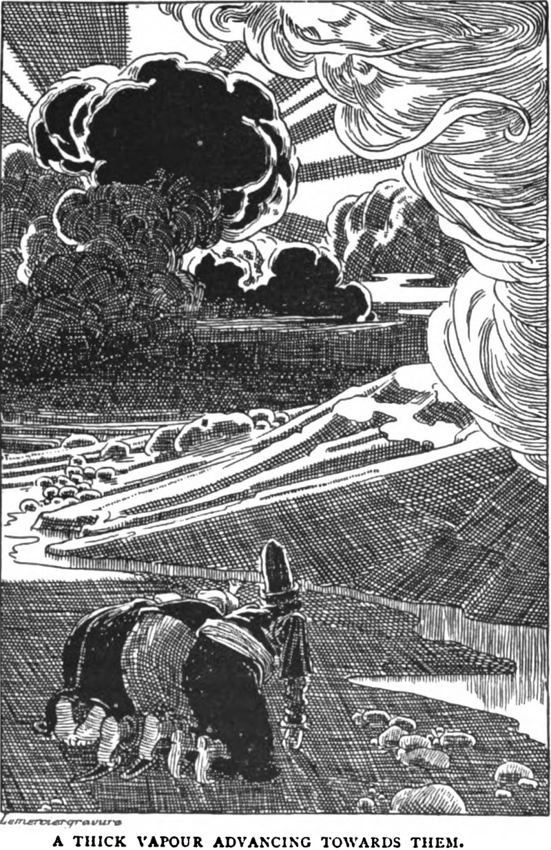 "A thick vapour advancing towards them."  From The Arabian Nights Entertainments, 1899.