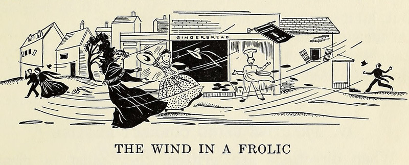"The mischievous wind.  The wind played a trick on two people the other day."  From The Children's Newspaper, 1938.