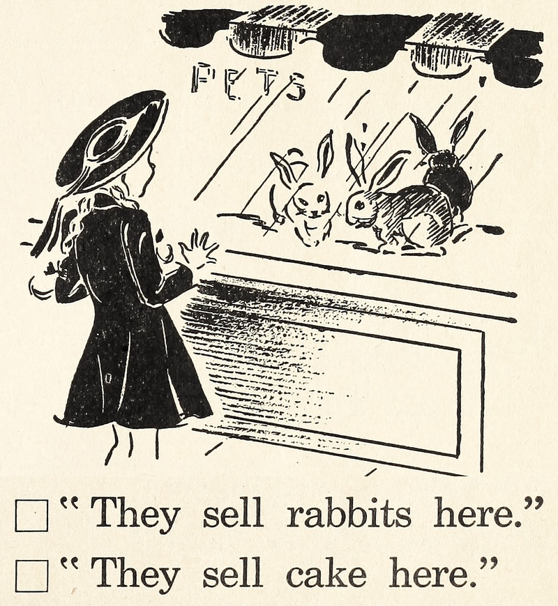 The answer is supposed to be "They sell rabbits here," not "They sell cake here," but of course in The Wicker Man, it can be both.  (Though, as Summerisle shopkeeper May Morrison says, ""Those are hares, not silly old rabbits. Lovely March hares.")  From My Do and Learn Book to Accompany On Cherry Street by Russell & Ousley, 1948.