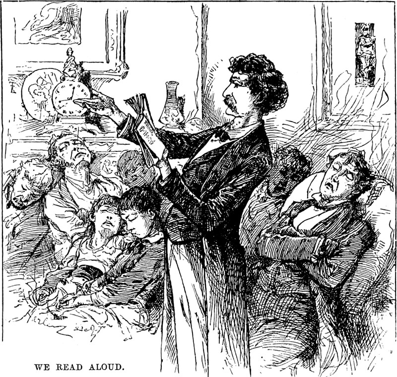 From Life on the Mississippi by Mark Twain, 1883.  The caption says, "We read aloud."