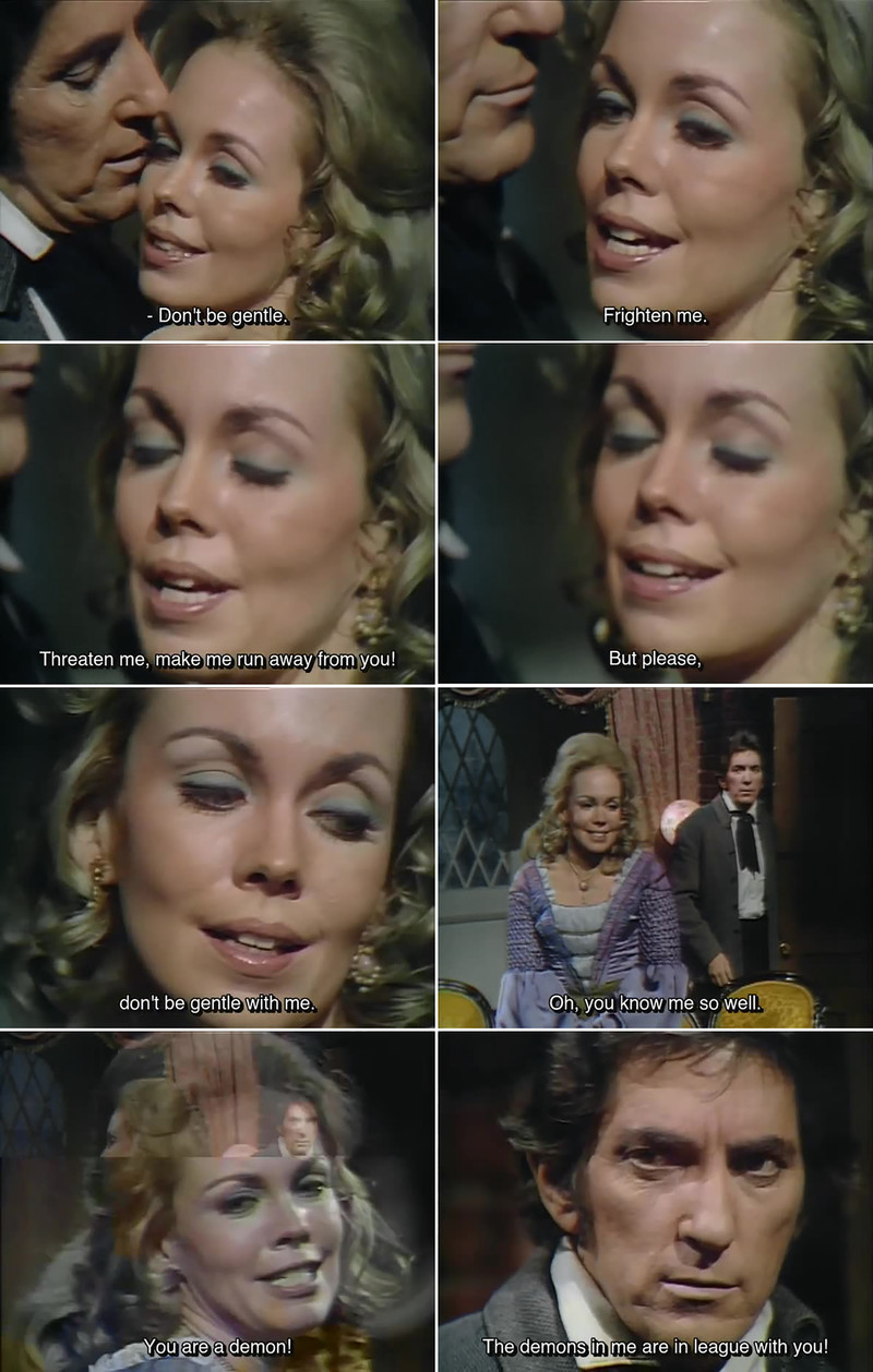 "Don't be gentle. Frighten me. Threaten me, make me run away from you! But please, don't be gentle with me. Oh, you know me so well. You are a demon! The demons in me are in league with you!" From Dark Shadows episode 1205.