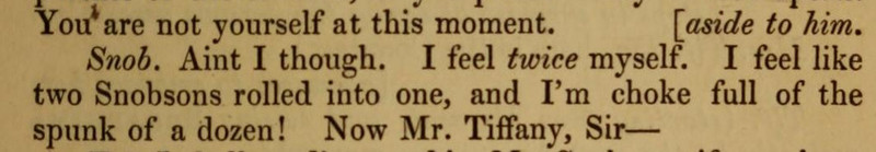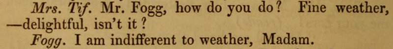 ***"There is a jenny-says-quoi look about this furniture."***"The true test of a poet is the velocity with which he composes."***"Miss Tiffany is not visible this morning." [To mean she's not receiving, i.e., cannot "be seen."]***Bonus funny business with names:1. One character is listed as "T. Tennyson Twinkle, a Modern Poet" ("modern" in this play dating to 1845, mind you!). At one point another character refers to him as a "rhyming dictionary," which of course we can file with walking encyclopedias and such.2. A character calling himself Count Jolimaitre (spoiler--he's a fake!) is at one point referred to as "Count Jolly--what-d'ye-call-it."3. The pseudo-Count, in the course of improvising some name-dropping, invents a "Lord Knowswho."