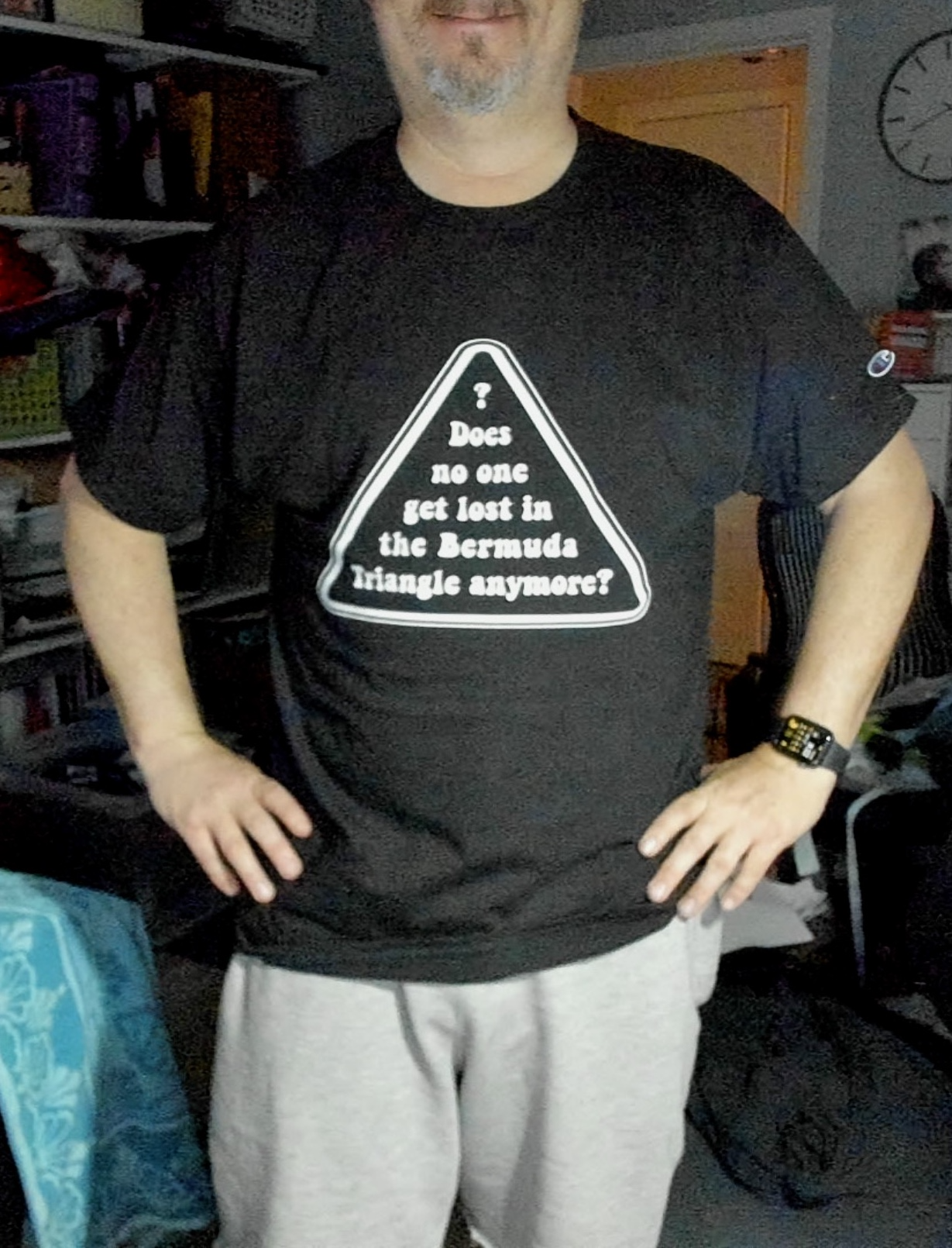 Thanks to the fan of our Standup Shtick who shared a photo of the Bermuda Triangle t-shirt he snagged.  The t-shirt quotes from this particular routine.