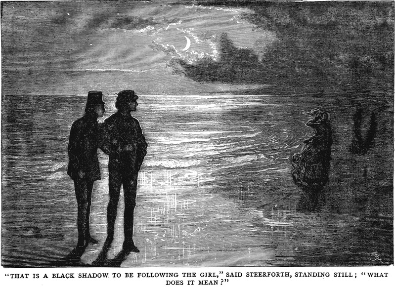 "'That is a black shadow to be following the girl,' said Steerforth, standing still; 'What does it mean?'"  From The Works of Charles Dickens, Household Edition.