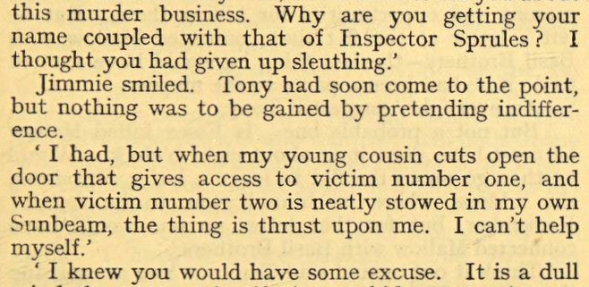 [As a certified teddy-bear counter, I note that the eponymous nightclub in this story actually has a facade decorated with *two* golden apes.]***He departed with much less assurance than he had come. Even his carnation was drooping.***When he spoke, he rolled his r's and his eyes.***"What sort [of moustache]? Soup strainer or nostril mat?"***