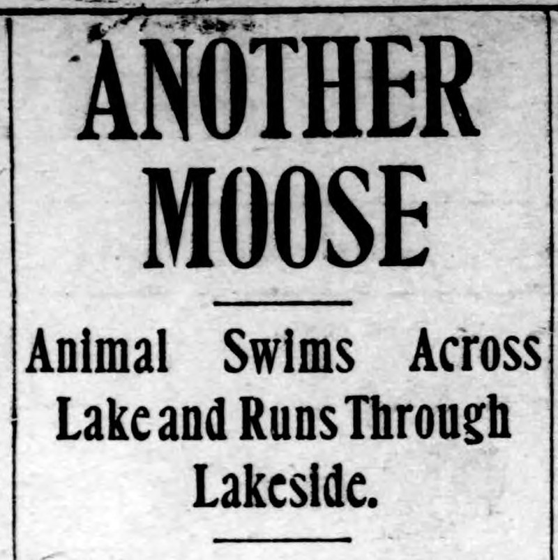 "Another moose.  Animal swims across lake and runs through lakeside."  From the Duluth Herald, 1905.
