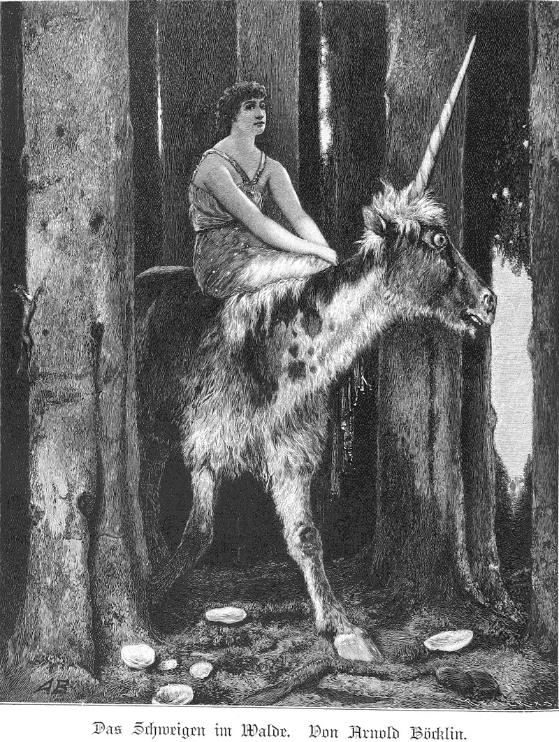This unicorn in a silent forest appears in Das Deutsche Volkstum by Hans Heinrich Joseph Meyer, 1899.  This should be of interest: A Field Guide to Identifying Unicorns by Sound.