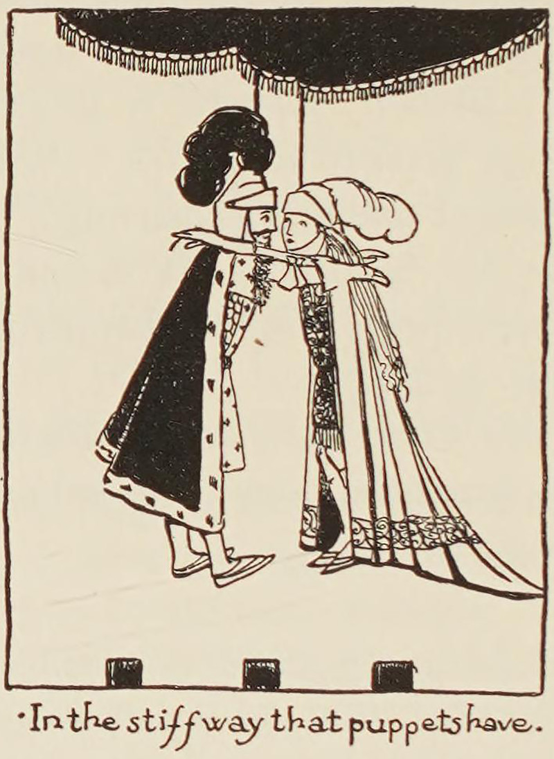 "In the stiff way that puppets share."  From The Heroes of the Puppet Stage by Madge Anderson, 1923.