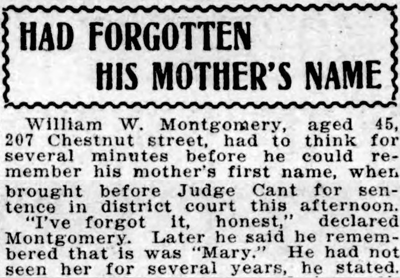 Duluth Herald of 1912, a man forgets his mother's first name, which turns out to be Mary. His excuse was that he hadn't seen her in several years.