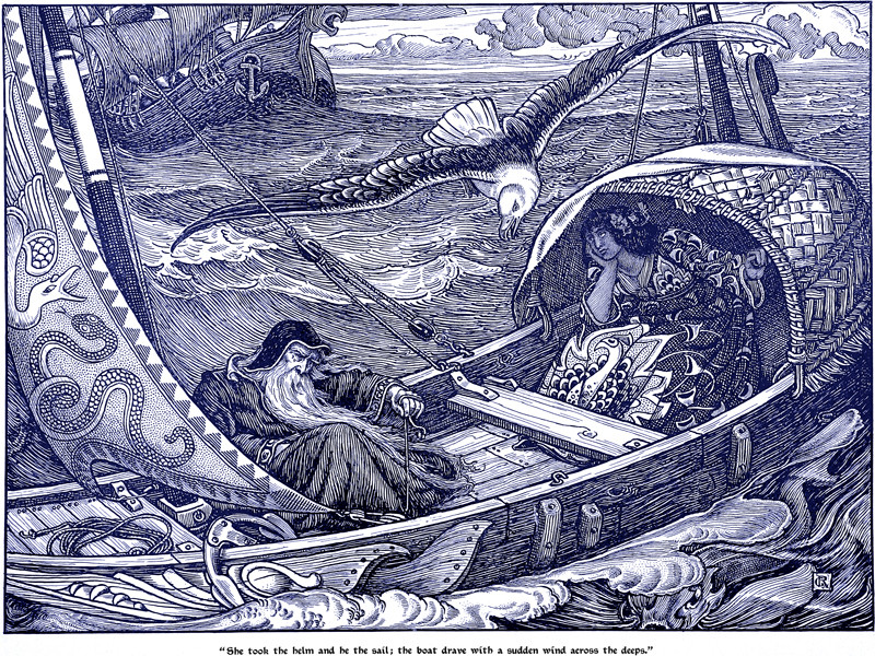 "She took the helm and he the sail; the boat drave with a sudden wind across the deeps." From Idylls of the King by Alfred Tennyson, 1898. A hi-res version of the image is here or here.