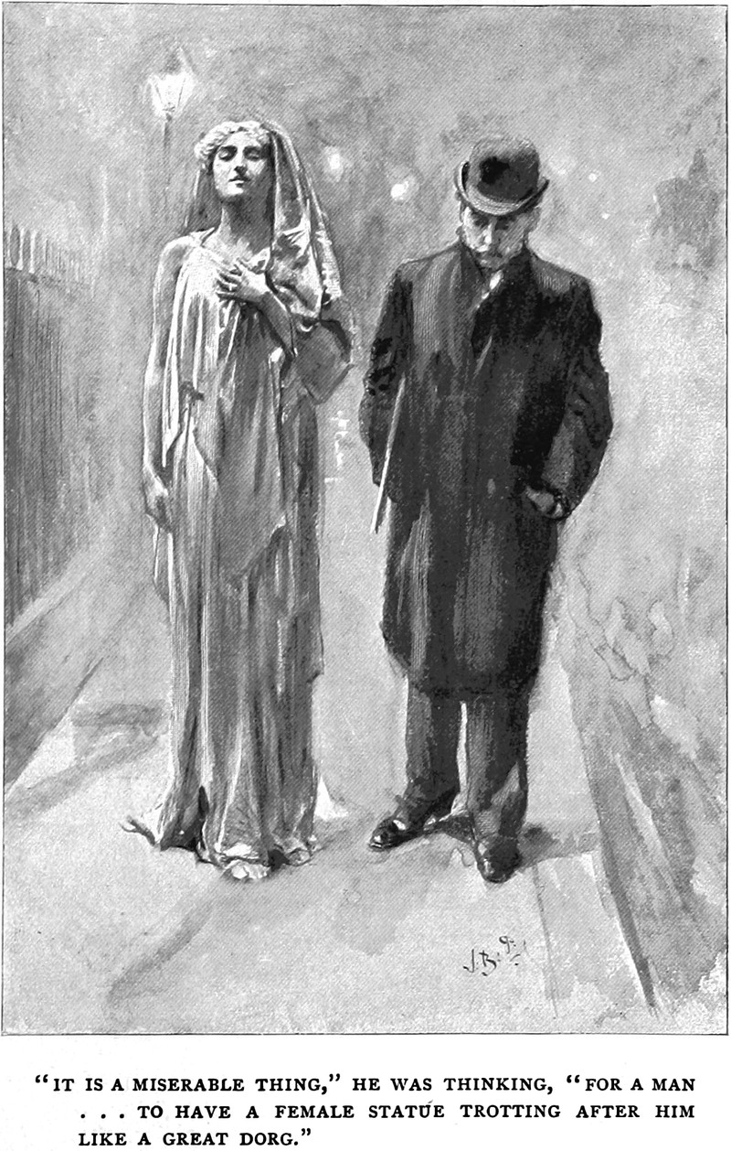 Here's a precursor to the "great dorg" of a film Mannequin (1987), from The Tinted Venus by J. Bernard Partridge, 1898.  The caption reads, "'It is a miserable thing,' he was thinking, 'for a man to have a female statue trotting after him like a great dorg.'"