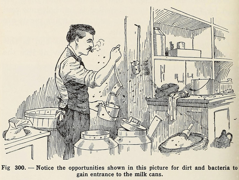 In the Land of Opportunity, there are so many opportunities for dirt and bacteria to gain entrance to the milk cans.  From Healthful Living, Based on the Essentials of Physiology by Jesse Feiring Williams, 1934.