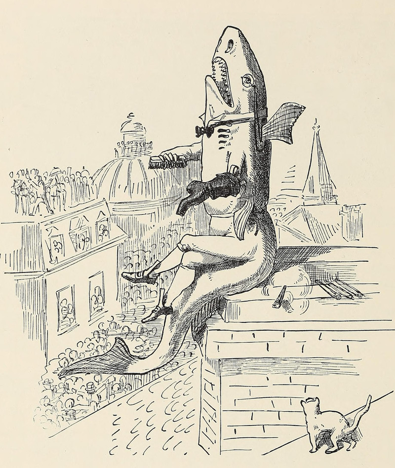 #vintage illustration #anthropomorphism #hybrid #rooftop #shark #illustration #1880s #sharkman #bootblack