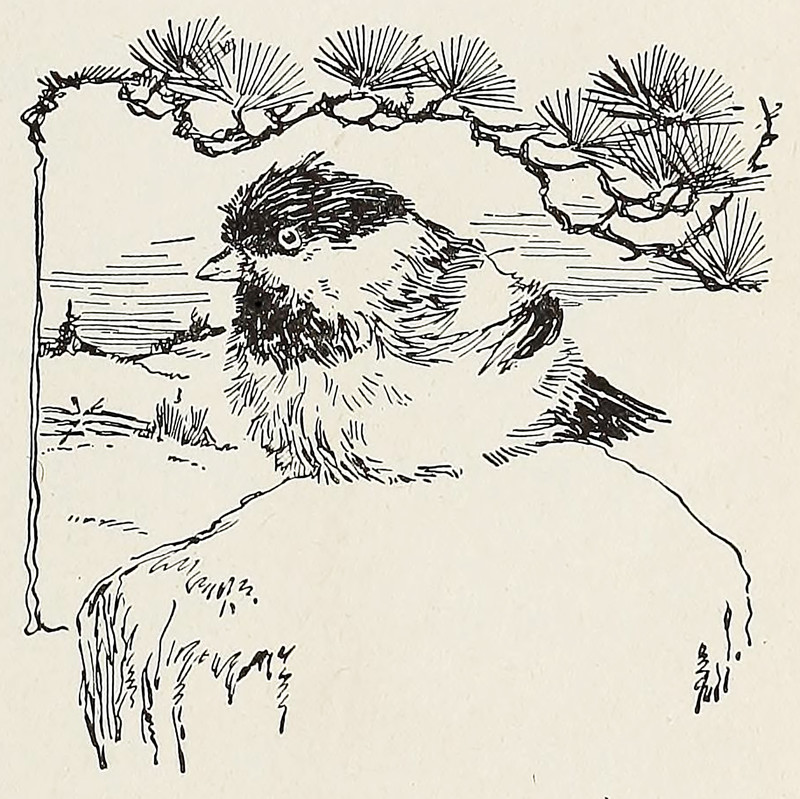 A black-cap chickadee.  From The Outdoor Book by Zoe Meyer and illustrated by Clara E. Atwood, 1928.
