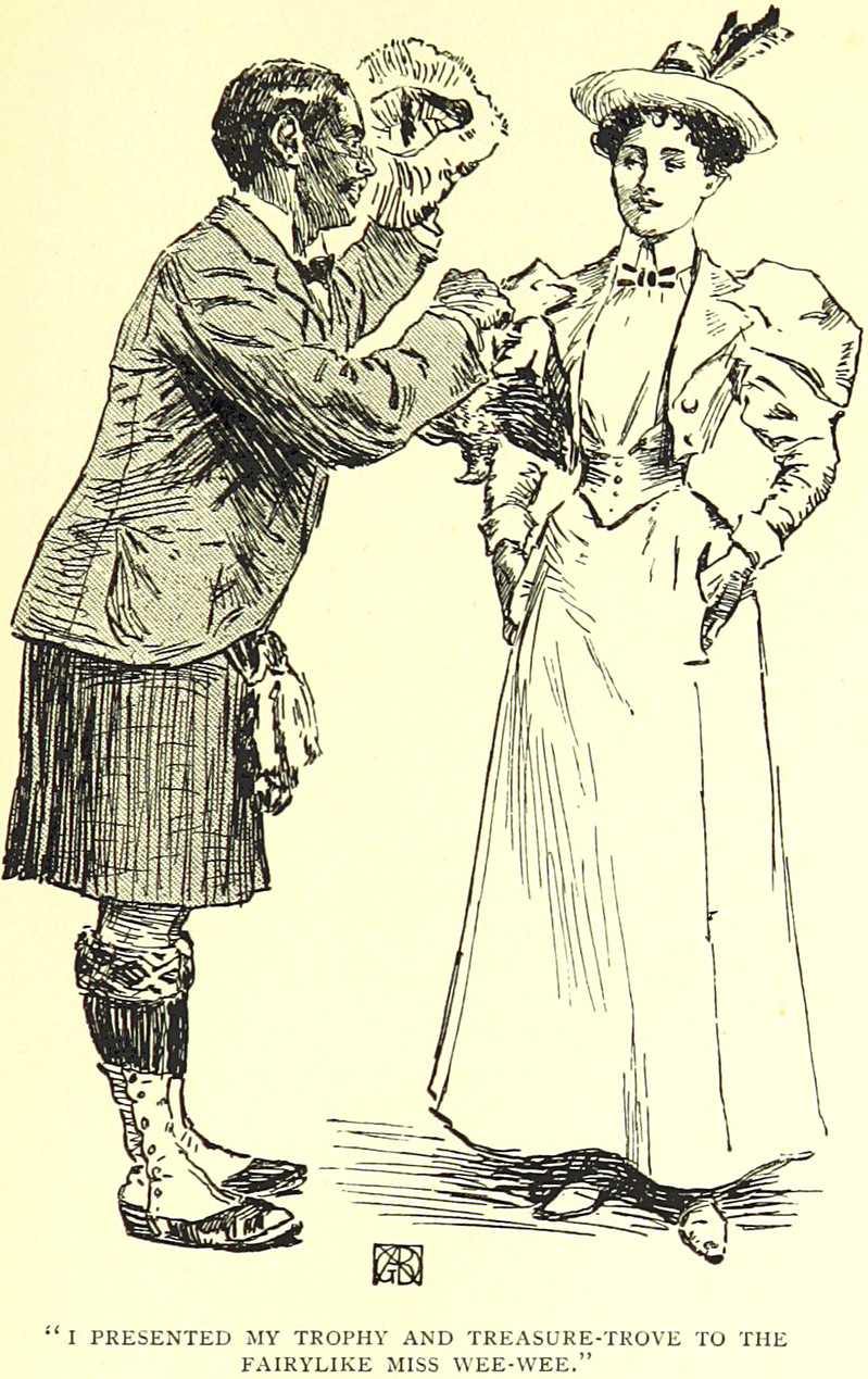 "I presented my trophy and treasure-trove to the fairylike Miss Wee-Wee." From Baboo Jabberjee by F. Antsey and illustrated by J. Bernard Partridge, 1897. [For Jeremy Edwards.]
