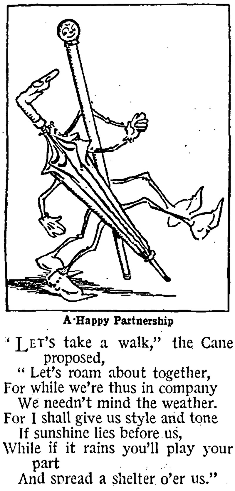 #vintage illustration #anthropomorphism #umbrella #1920s #walking stick #illustration #poem #cane